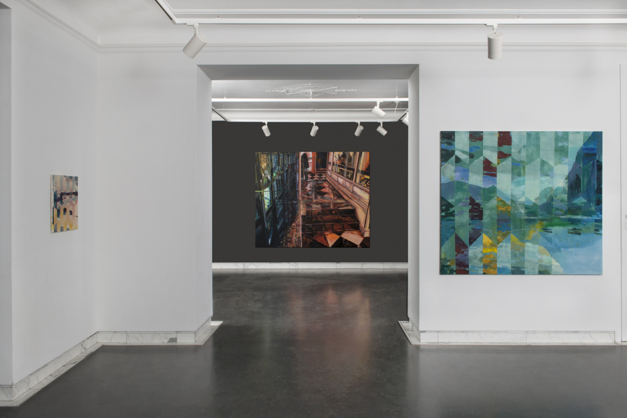 "Der Kühle glanz der Sehnsucht gegen den flüchtigen Moment der Zeit" features works by Tony Cragg, Anna Freeman Bentley, Michelle Jezierski and Alfons Pressnitz. Michelle Jezierski’s paintings create a new image of landscape: overlapping structures, fragments of diverse origin, combined with lines, grids and planes that complement, penetrate and dissolve each other. In contrast to Jezierki’s vast space, Anna Freeman Bentley’s inner space is dense. Alfons Pressnitz confronts the idyll of landscape with its counterpart, consciously settling a score with the romantic notion of landscape. The works of Tony Cragg add a sculptural component to the exhibition. Countless organic units merge into one big whole.